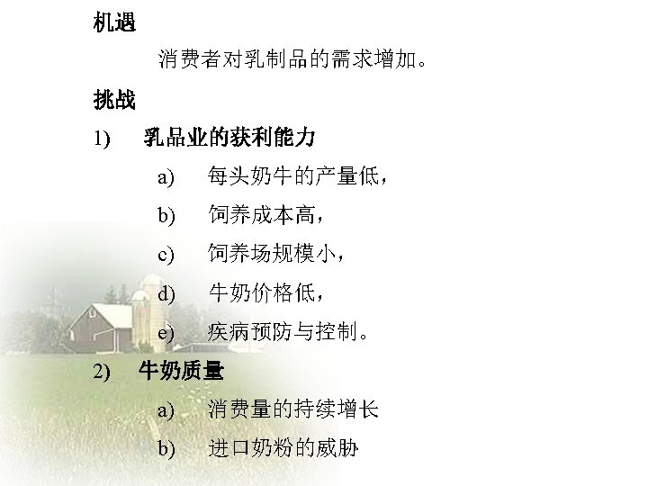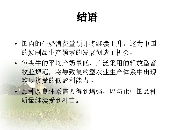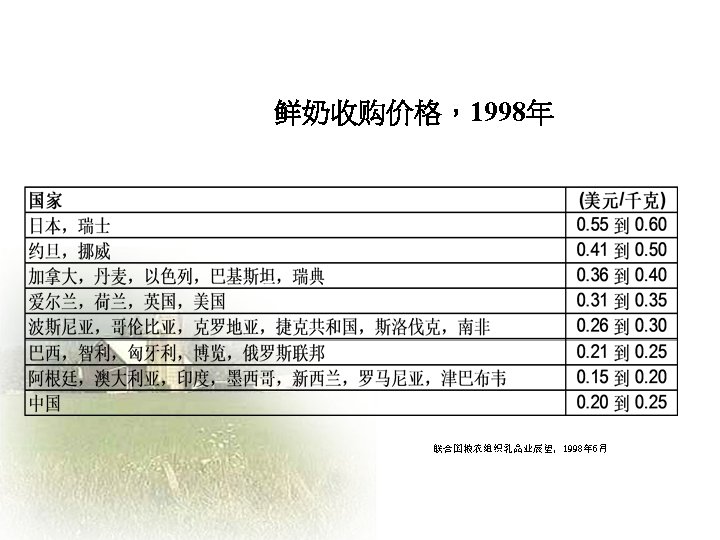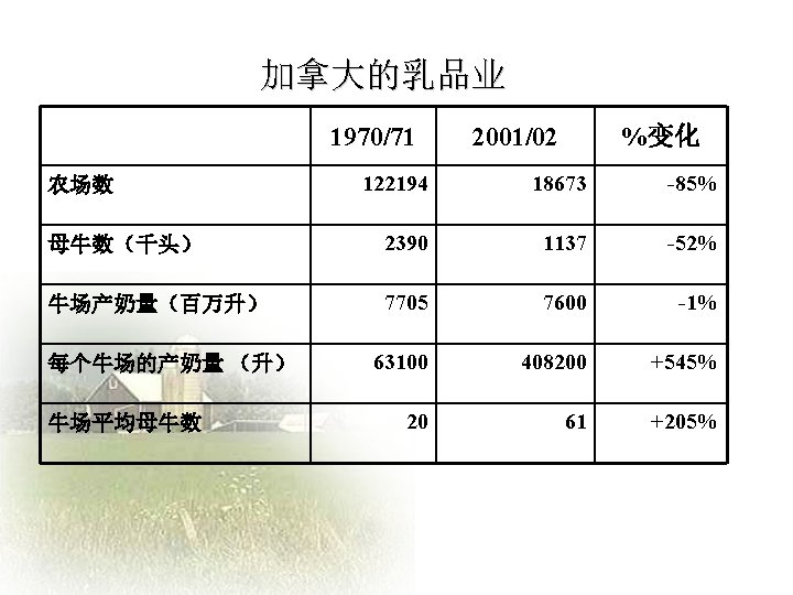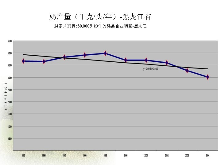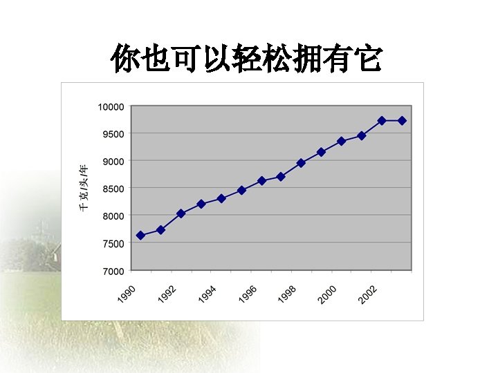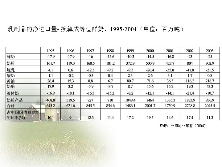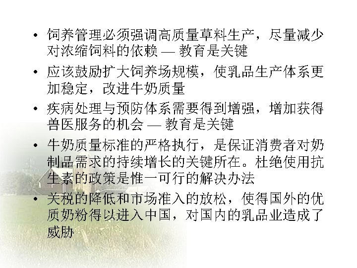 Challenges and Opportunities facing the Chinese Dairy Industry Slides: 20 Download presentation 中国乳品业面临的挑战和机遇 Challenges and Opportunities facing the Chinese Dairy Industry 罗伯特 • 华生 Robert Watson 人均年牛奶消费量—中国 年度 城镇地区人均(千克) 农村地区人均(千克) 全国人均(千克) 1995 16. 0 0. 64 5. 1 1996 16. 0 0. 8 5. 4 1997 14. 7 0. 95 5. 4 1998 15. 5 0. 93 5. 8 1999 17. 3 0. 96 6. 7 2000 19. 8 1. 06 7. 8 2001 22. 1 1. 2 9. 1 2002 28. 4 1. 19 11. 8 2003 34. 5 1. 7 15. 1 加入WTO后乳制品关税年度降低额 关税率: % 乳制品规范 入世时的关税 2002 2003 2004 2005 鲜奶 04011000 21 19 17 15 04012000 21 19 17 15 04013000 21 19 17 15 04021000 15 13. 8 12. 5 11. 3 10 04022100 20 17. 5 15 12. 5 10 04022900 20 17. 5 15 12. 5 10 04029100 36. 7 30 23. 3 15 10 04029900 36. 7 30 23. 3 15 10 04031000 34 26 18 10 04039000 38 32 26 20 04051000 36. 7 30 23. 3 15 10 04052000 36. 7 30 23. 3 15 10 04059000 36. 7 30 23. 3 15 10 04061000 34. 8 27. 2 19. 6 12 04062000 34. 8 27. 2 19. 6 12 04063000 34. 8 27. 2 19. 6 12 04064000 36 29 22 15 04069000 34. 8 27. 2 19. 6 12 奶粉 酸奶 乳清 04049000 黄油 奶酪 数据来源:MOFTEC