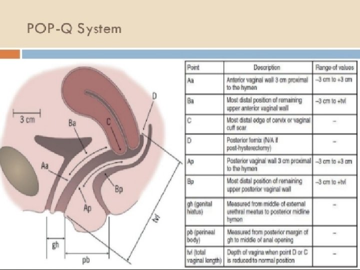 • Uses a fixed reference point – hymenal remnants, called point zero (0) • Positive (+) values outside the vagina (hymenal remnants) • Negative (-) values inside the vagina • Site specific defined points referenced to the place of the hymenal remnants