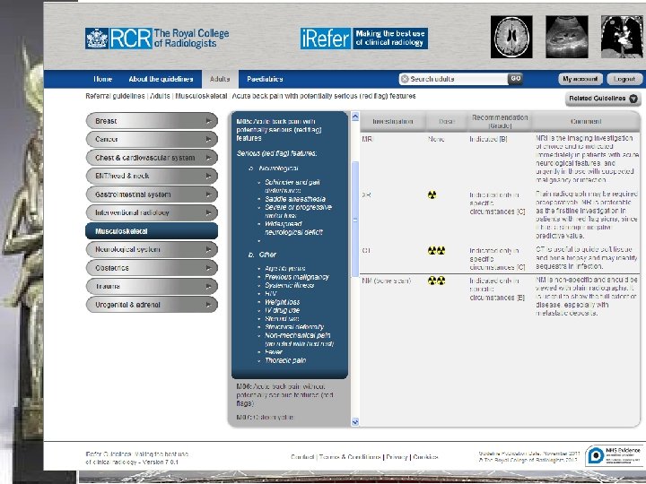 Monitoring of guideline use in workflow 1. Clinic-radiological meetings (MDT meetings) Can influence: i. Future imaging choices in the individual case ii. Imaging referral behaviour. 2. Educational messages in reports esp. to GPs Sustained 20% reduction in referral possible “Lumbar imaging for low back pain without suggestion of serious underlying conditions does not improve clinical outcomes. See M 04 http: //www. rcr. ac. uk: 2059/adult/#Tpc 151 http: //www. nice. org. uk/guidance/CG 88/chapter/1 -Guidance ” 3. Through CDS- dashboard can give ratings of appropriateness