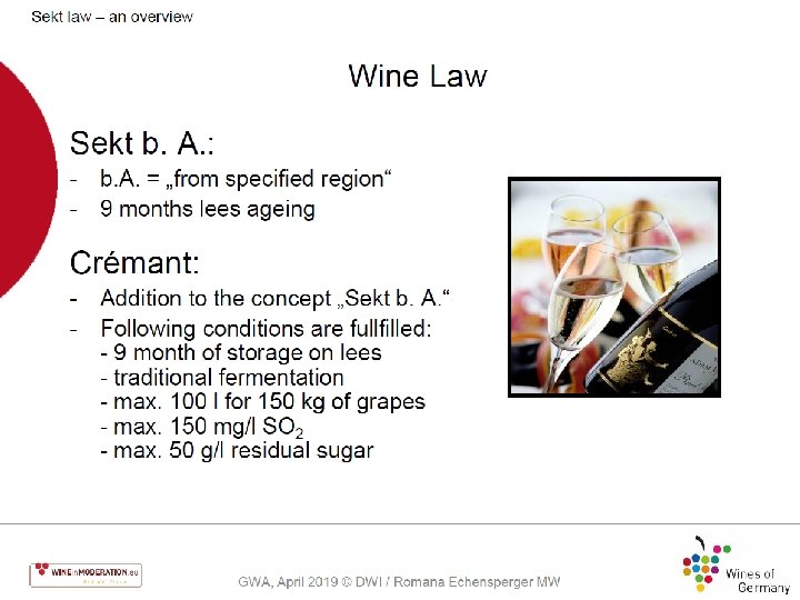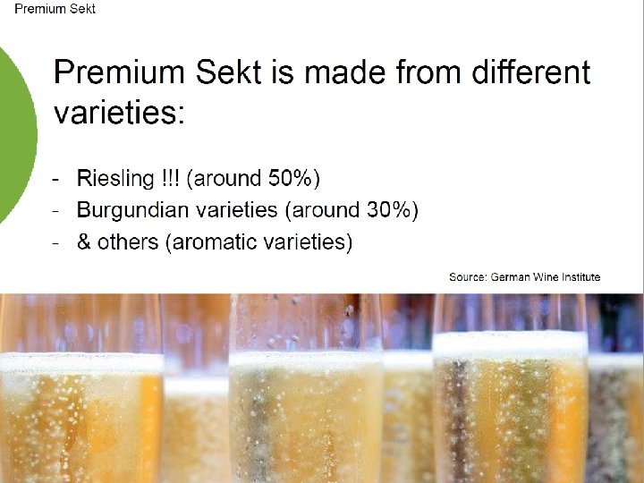 PDO Quality English Sparkling Wine Sugar allowed in the production of the cuvee (still wine), not to exceed additional 3% alcohol from naturally occurring sugar Cuvee can not be less than 9% alcohol, final Sparkling wine can not be less than 10% and the tirage liqueur may not increase total alcohol by more than 1. 5% De-acidification of cuvee is allowed Sweetening of cuvee is not permitted Traditional Method 9 months aging in lees (12 -24 is common) Source: Retrieved from http: //www. ukva. org. uk/wp-content/uploads/2017/03/DEFRAGUIDANCE-PDO-ENGLISH. pdf