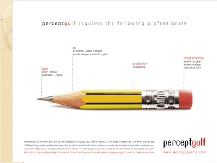 Tehnik Stopping Power Pernahkah Anda melihat satu halaman iklan yang kosong dan hanya berisi beberapa kalimat serta logo? Bukan berarti boros dalam beriklan, namun itulah Stopping Power, masyarakat yang menjadi Audience nya akan berhenti untuk melihat dan membaca. Bagaimana menciptakan Stopping Power? Sajikan yang lain daripada yang lain! Stopping Power adalah daya yang seharusnya dimiliki oleh sebuah iklan, agar mampu menjerat pandangan Audience-nya.