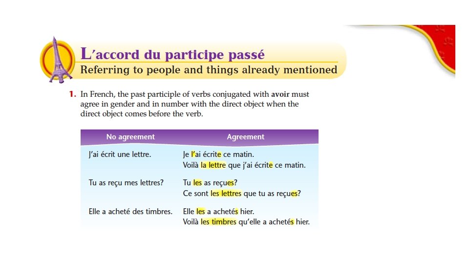 Change the past participle if necessary e 1. Elle est sorti avec ses amis. 2. Elle a fait ses devoirs en classe. 3. Je suis contente de la lettre que j’ai écrite (e)s 4. Nous sommes monté au sommet de la montagne. 5. Elles ont vu la Tour Eiffel 6. Où sont les devoirs que vous avez faits ? 7. Où est Marie? Je ne l’ai pas vue au cinéma. 8. J’ai fait mes devoirs mais je ne les ai pas apportés en classe.