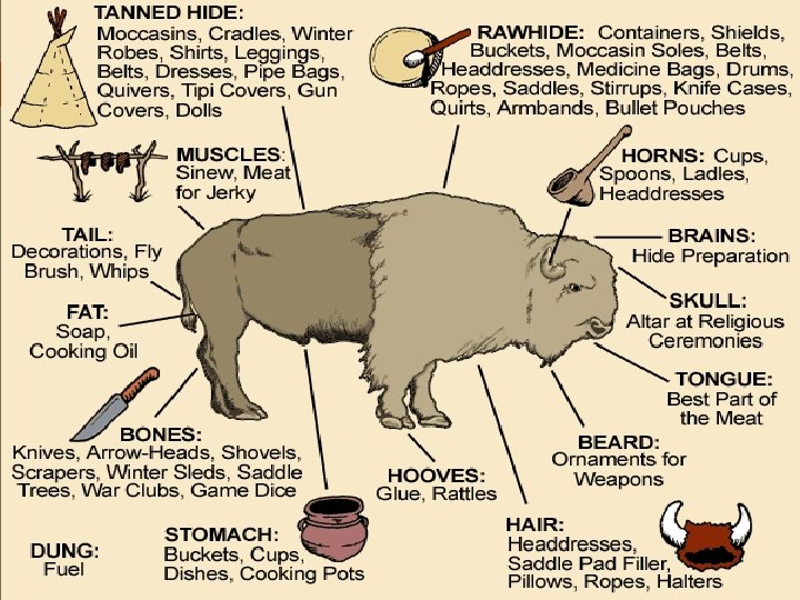 The Culture of the Plains Indians Family Life • Form family groups with ties to other bands that speak same language • Men are hunters, warriors; women butcher meat, prepare hides • Believe in powerful spirits that control natural world - men or women can become shamans • Children learn through myths, stories, games, example • Communal life; leaders rule by counsel NEXT