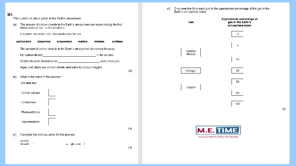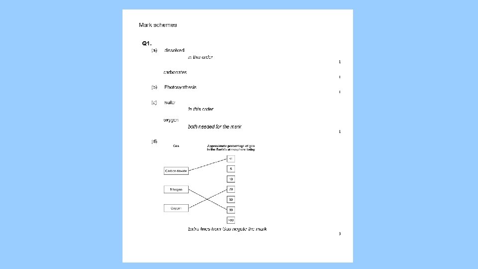 Complete the following questions about our learning Todays lesson Last lesson 1. What has happened to Carbon dioxide levels on Earth? 2. Which process began adding Oxygen to the atmosphere? 3. Name 2 gases that were present in the early atmosphere. 4. Which structures probably created the first atmosphere? 5. What effect did the first oceans have on CO 2 levels? 6. How old is the Earth?