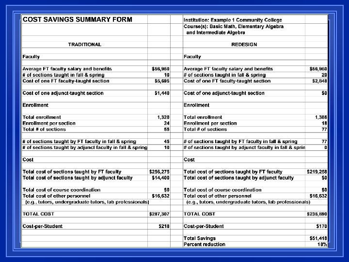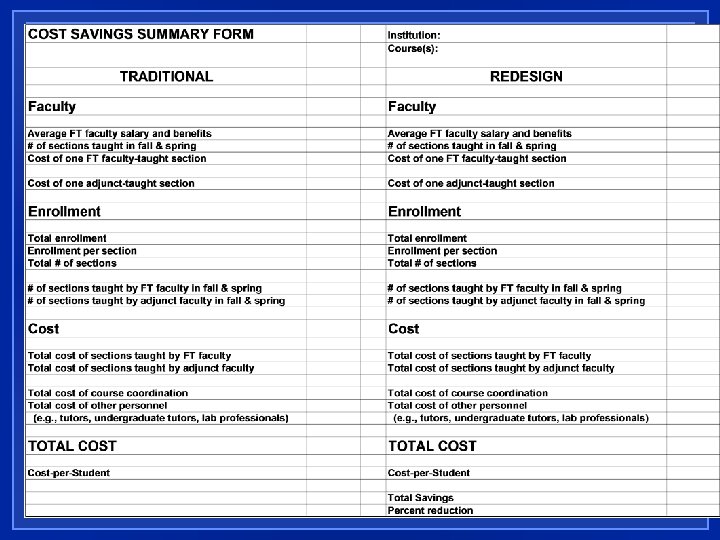 COST SAVINGS SUMMARY FORM A formatted spreadsheet that enables institutions to compare the cost of the traditional course with the cost of the redesigned course (types of sections, number of students enrolled and the kinds of personnel)