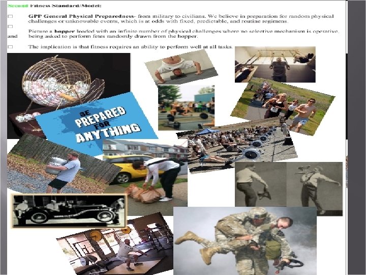 Third Fitness Standard/Model: • These “metabolic engines” are known as the phosphagen , the glycolytic , and the oxidative pathways. • The first, the phosphagen, dominates the highest-powered activities, those that usually last less than about ten seconds, but can be stated as 0 -30 sec. • The second pathway, the glycolytic, dominates moderate-powered activities, those that last 30 -90 sec. and sometimes a little bit more. • The third pathway, the oxidative, dominates low-powered activities from 90 sec and beyond. • • Balancing the effects of these three pathways largely determines how and why of the metabolic conditioning.