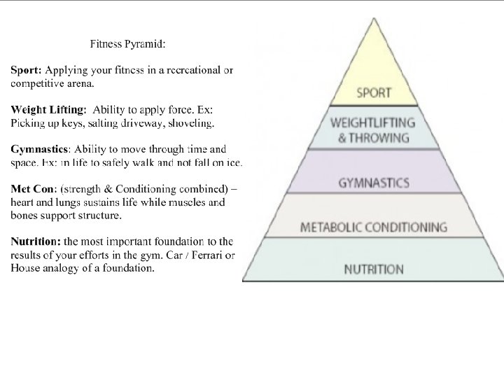 FITNESS FORMULA: What does this mean to you? “Functional Movement (FM), High-Intensity (HI), Constantly Varied (CV). ” Functional Movement FM= things we do in daily life. (UMRP) universal motor recruitment patterns performed in a wave of contraction from (CTE) core to extremity; and they are compound movements (multijointed) for the production of high power. FM: Example, See person across street drop their keys vs. doing a lateral raise motion. CTE: Example, Throwing a ball, punch or serving a ball. Demo in fractions vs CTE Only place we don’t move this way is sleep and machines in Globo gym. Machines do have a place in strength base for dormant muscles and body building. Avoid decrepitude