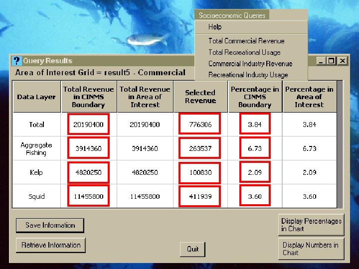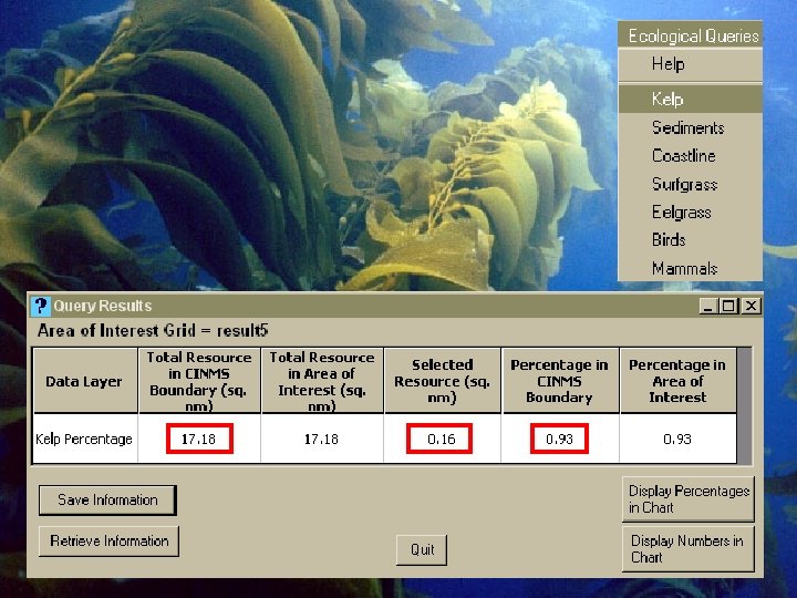 Spatial Support and Analysis Tool • • Visualize Query Design Analyze Shoreline Depth Sediments Kelp Conservation Value Commercial Fisheries Recreational Fisheries Non-consumptive Recreational Activities Personal knowledge Options