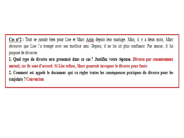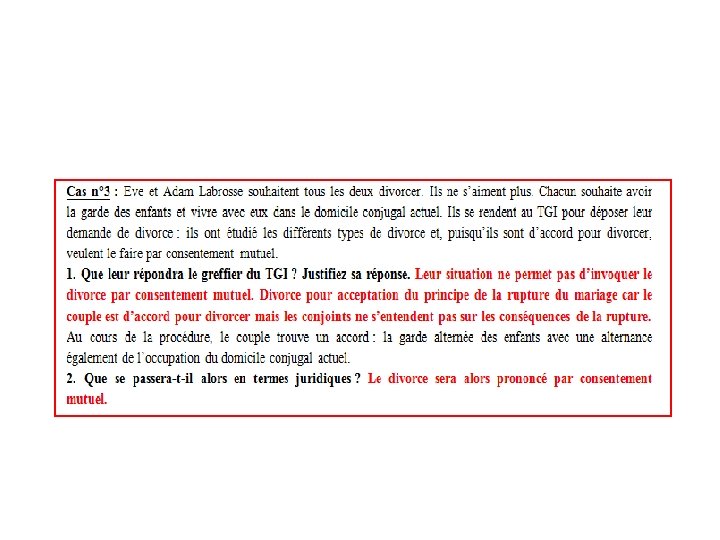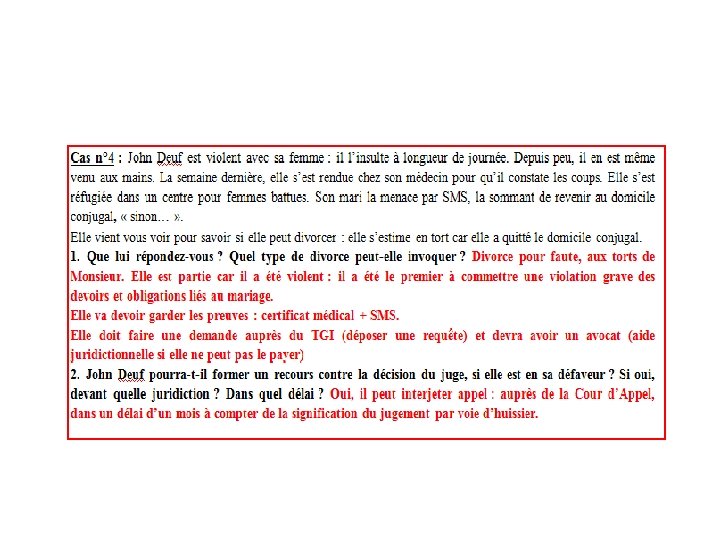 2. Le divorce Il existe 4 types de divorces : 1 Divorce par consentement mutuel : les deux conjoints sont d’accord pour divorcer. 2 Divorce pour acceptation du principe de la rupture du mariage : les deux conjoints sont d’accord pour divorcer mais ils ne sont pas d’accord sur les conséquences du divorce (garde des enfants, jouissance de la maison…) 3 Divorce pour faute : en cas de violation grave aux devoirs et obligations du mariage (violences, adultère – de moins en moins un motif de divorce pour faute) 4 Divorce pour altération définitive du lien conjugal : cessation de la communauté de vie depuis plus de deux ans. C’est le JAF (TGI) qui est compétent dans les affaires de divorce.
