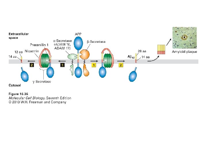 Neurodegenerative Diseases In neurodegenerative diseases such as Alzheimer's disease and transmissible spongiform encephalopathy (mad cow), insoluble misfolded proteins accumulate in the brain in pathological lesions known as plaques, resulting in neurodegeneration (Fig. 3. 18). In Alzheimer's disease, the protein known as amyloid precursor protein is cleaved into a peptide product (b-amyloid) that aggregates and precipitates in amyloid filaments. The misfolding of b-amyloid, which involves a transition from helical to b sheet conformation leads to filament formation. In mad cow disease, prion proteins precipitate causing lesions.