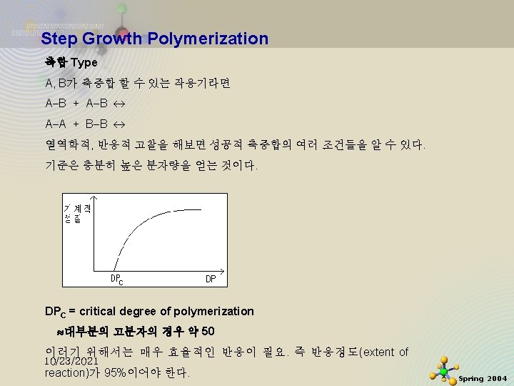 Equal Functional Group Reactivity Concept 고분자물질 형성 반응에 따른 자유에너지 변화는 GP = Gpolymer Gmonomer = (HP – Hm) – T(SP – Sm) = HP – T SP Where HP : enthalpy change per monomer unit SP : entropy change per monomer unit GP < 0 Polymerization is spontaneous GP > 0 Polymerization is not possible GP = 0 monomer polymer 이때의 온도를 ceiling temperature. (for both step and chain growth) 10/23/2021 Spring 2004