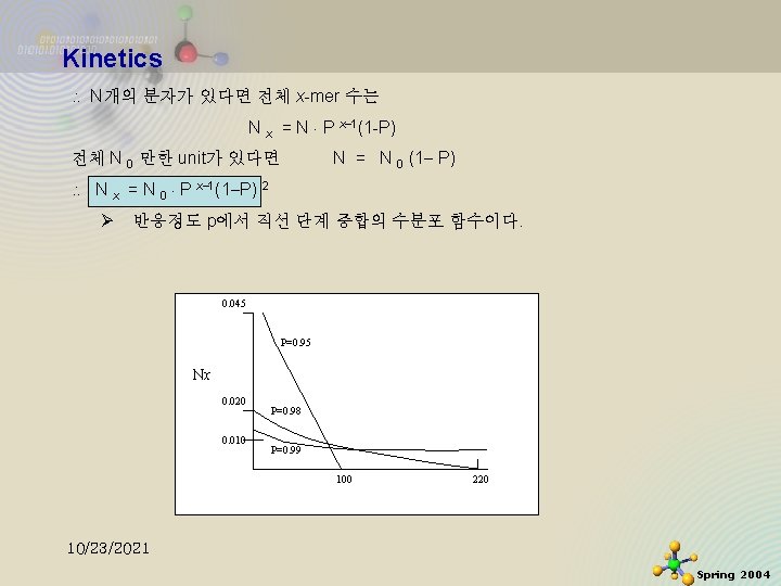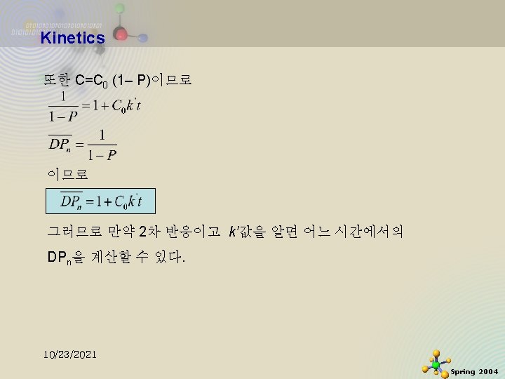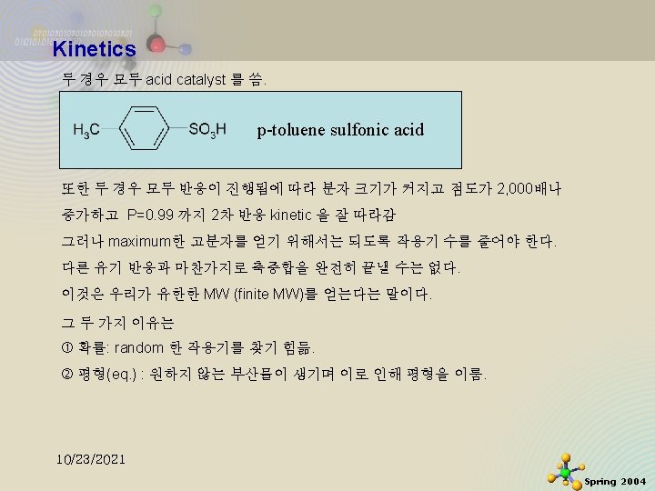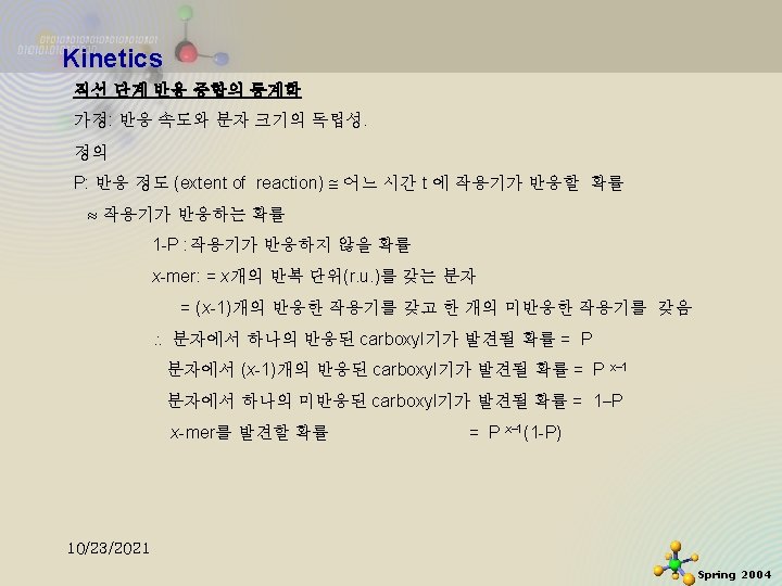 Kinetics Polyesterfication as an example of polycondensation 촉매로 강산을 집어넣는 경우, 순수한 모노머와 정확한 당량이라고 가정 [COOH]c= [OH]c = C –dc/dt = k C 2 [H +] –dc/dt = k’ C 2 ※ see 2 -17 b Odian k: bimolecular rate constant where k’ = k [H +] second – order rexn –dc/ C 2 = k’dt C 0 C t 0 t integrate하면 1/C – 1/C 0 = k’t 만약 중합반응이 uniform 하게 2차반응이고 k’값에 변화가 없으면 반응 도를 나타내는 값 P 로 표시하는 것이 일반적임. 10/23/2021 Spring 2004