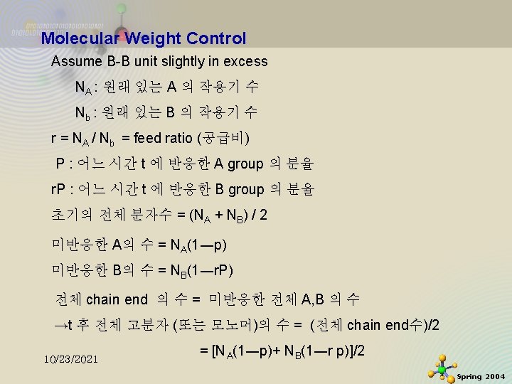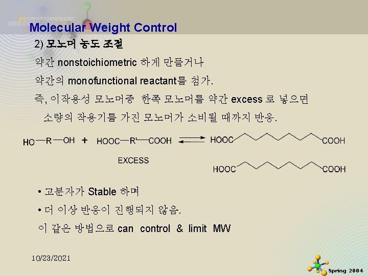 Molecular Weight Control Target Molecular weight DPn is time – dependent 1) Quench (cooling) the polymerization at pre- determined time 이 경우 고분자는 그 후 공정을 거칠 때 불안정해짐. 주로 heating 하면 unstable 해짐. react as heating undesirable 10/23/2021 Spring 2004