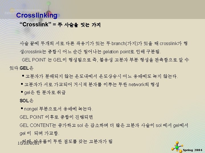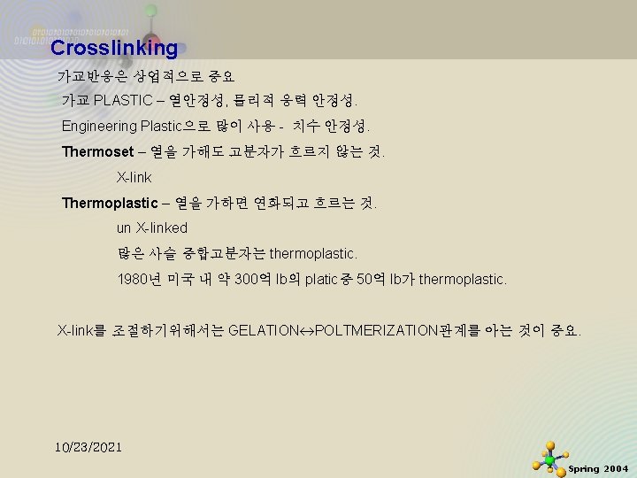 축중합 고분자들의 예 Marvel 교수에 의해 1961년 합성 초기에는 여러가지 문제들 발견 stoichiometric problems, side reactions, oxidatio, … 요즈음 reaction temperature를 낮추고(200~250°C) polar solvent 내에서 중합 Celanese社(http: //www. celanese. com)에서 1966년 인수, 현재 미국S. C. 주에 대단위공장 가동 중. not burn easily, self-extinguishing, but still expensive $45/lb in 1985 10/23/2021 Spring 2004