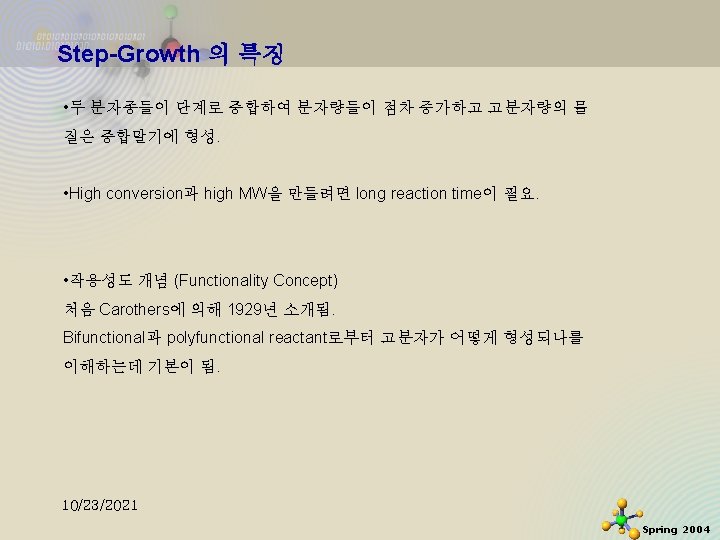 Step-Growth 의 특징 미국화학회지 (Journal of American Chemical Society, 51, P. 2548 (1929)) “Polyintermolecular condensation requires as starting materials compounds in which at least two functional groups are present in the same molecule” 10/23/2021 Spring 2004