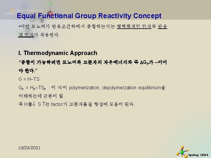 Equal Functional Group Reactivity Concept 그러면 GP가 (–) 면 무조건 반응이 가능한가? II. Kinetic Approach “A negative GP does not necessarily mean that polymerization occurs under a particular set of reaction conditions and reaction sites” e. g) should have functional group proper initiator temperature etc. 10/23/2021 Spring 2004