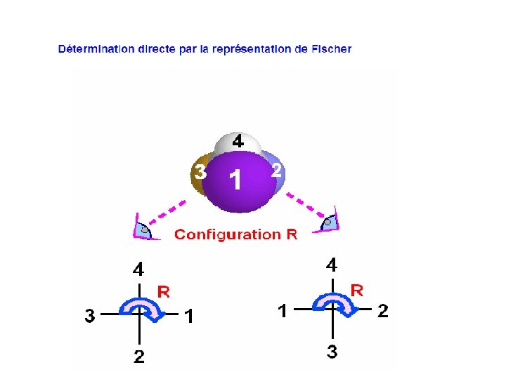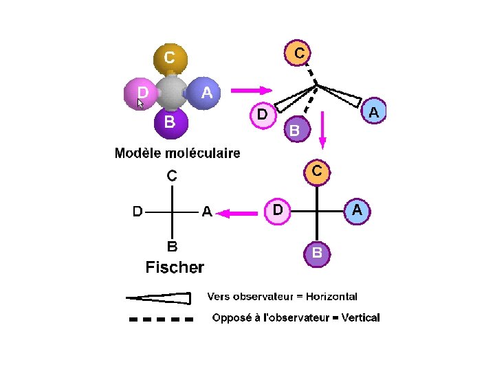 Représentation de Fischer La représentation de Fischer est particulièrement utilisée pour la représentation des sucres. Dans sa version " standard " on doit placer la chaîne carbonée verticalement ; l'atome de carbone qui porte le numéro le plus petit (porteur de la fonction aldéhyde dans le cas d'un sucre) est placé en haut ; les liaisons " horizontales " pointent vers l’avant du plan du papier, c’est à dire vers l’observateur. Nous utiliserons ici une version " simplifiée " utilisable pour n’importe quelle molécule (et donc sans se préoccuper des fonctions qu’elle possède ni de la position relative du carbone numéroté 1) en utilisant les conventions suivantes.