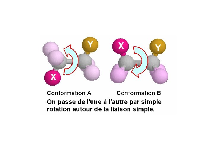 Conformation · les conformations d'une molécule sont les arrangements des atomes qui ne se différencient que par des rotations autour de liaisons simples. Pour passer d’une conformation à une autre, il suffit de faire tourner la molécule autour d’une liaison simple. On ne doit pas casser de liaisons pour en reformer d’autres A la température ambiante, les rotations autour des liaisons simples se font très rapidement, et le même composé existe simultanément sous plusieurs conformations différentes en équilibre entre elles.