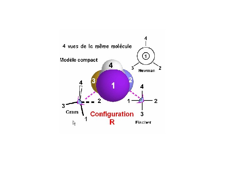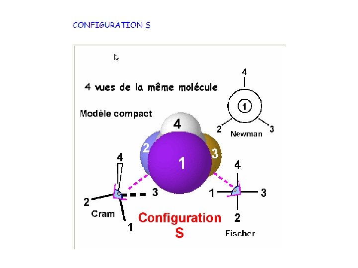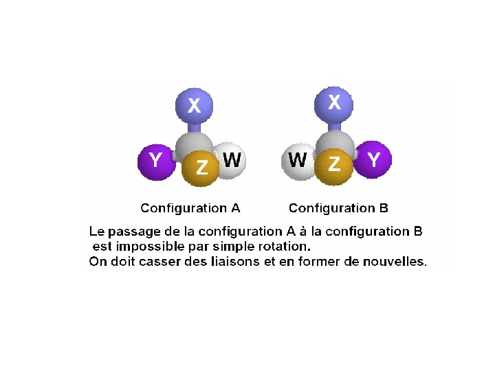 Configuration la configuration d'une molécule est la disposition de ses atomes dans l'espace indépendamment des rotations autour des liaisons simples. Pour passer d’une configuration à une autre, on doit casser des liaisons et en reformer d’autres. Le passage d’une configuration à une autre est un processus difficile qui met en jeu une réaction chimique. Il n’y a pas d’équilibre entres deux configurations différentes.
