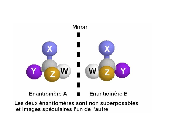 Enantiomères Deux structures sont énantiomères si elles sont image l’une de l’autre dans un miroir et non superposables. Deux énantiomères ne diffèrent que par leur action sur la lumière polarisée. L’un est dextrogyre (il dévie la lumière polarisée vers la droite) et l’autre lévogyre (il dévie la lumière polarisée vers la gauche). Toutes leurs autres propriétés physiques sont identiques.