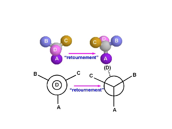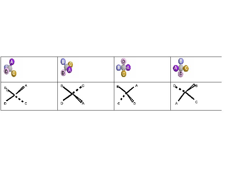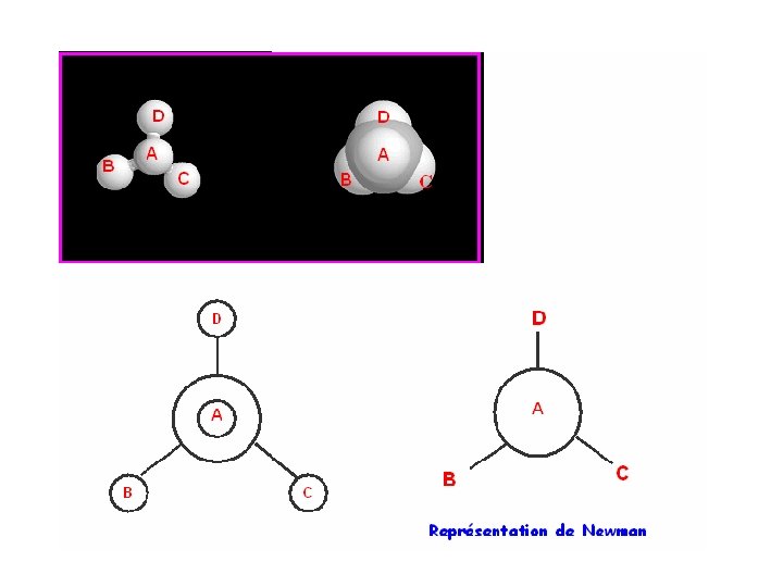 Projection de Newman La molécule est dessinée en projection selon une liaison perpendiculaire au plan du papier. Pour se fixer les idées voici un premier exemple avec un carbone central lié a 4 substituants différents quelconques A, B, C, D. La liaison A-Carbone est prise comme axe de projection.