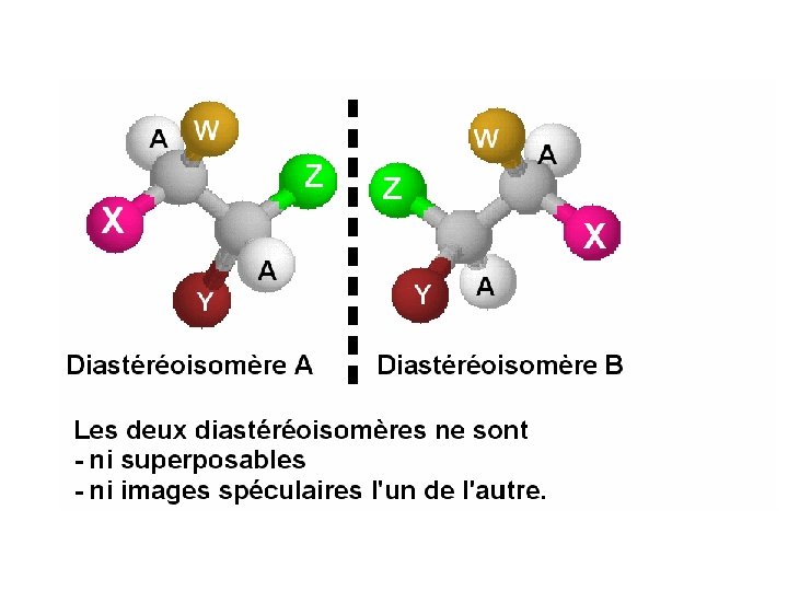 Diastéréoisomères Deux structures sont des diastéréo-isomères si elles ne sont pas superposables mais ne sont pas image l’une de l’autre dans un miroir. Les propriétés physiques de deux diastéréoisomères sont différentes.