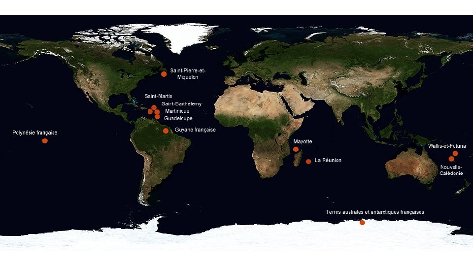 1. Comment gérer des territoires aussi éloignés de la métropole? • Les territoires ultra-marins français ont différents statuts: • DROM: Départements et Régions d’Outre Mer (Réunion, Martinique, Guadeloupe, Guyane, Mayotte): Même statut qu’un Département ou une Région de la métropole. • Pour l’U. E. les D. R. O. M. sont des R. U. P. (Régions Ultrapériphériques) et à ce titre, reçoivent des aides spéciales au développement. • COM: Collectivités d’Outre Mer (St-Pierre et Miquelon, Wallis-et-Futuna, Polynésie Française, St Barthélémy et St Martin). Plus autonomes. Possèdent une assemblée qui fixe les conditions d’application de la loi française. • http: //numeres. net/9782210106185/res/9782210106185 -ani-hgemc 3 -cai 07/index. html