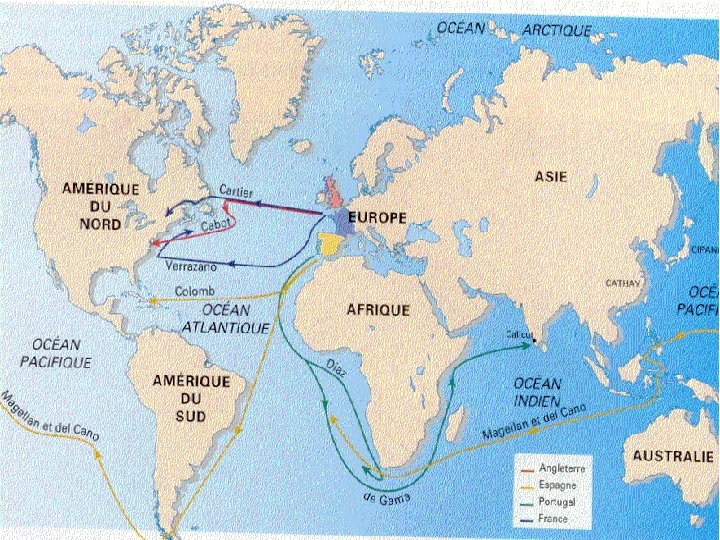 Le Portugal et l’Espagne furent les premiers. • Portugal : Diaz ira en Afrique Vasco de Gama ira en Inde (épices baissent de prix) • Espagne : Colomb ira dans les Antilles en croyant avoir atteint l’Asie.