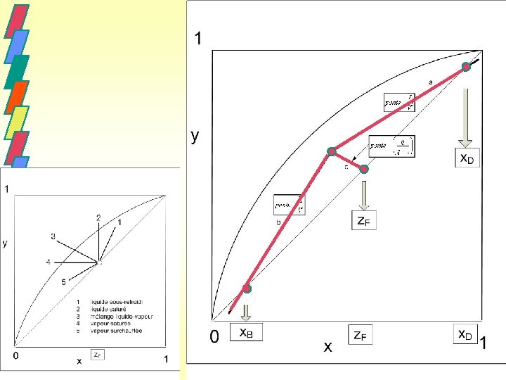 3. 6 Construction graphique Les variables connues ou calculables analytiquement ou graphiquement sont: Le nombre de plateaux nécessaire à la séparation, découle des constructions suivantes: a) on place le point et on trace la droite opératoire de pente b) on place le point et on trace la droite opératoire de pente c) on place le point et on trace la droite de l'alimentation de pente . d) on fait la construction en escalier en partant de ou