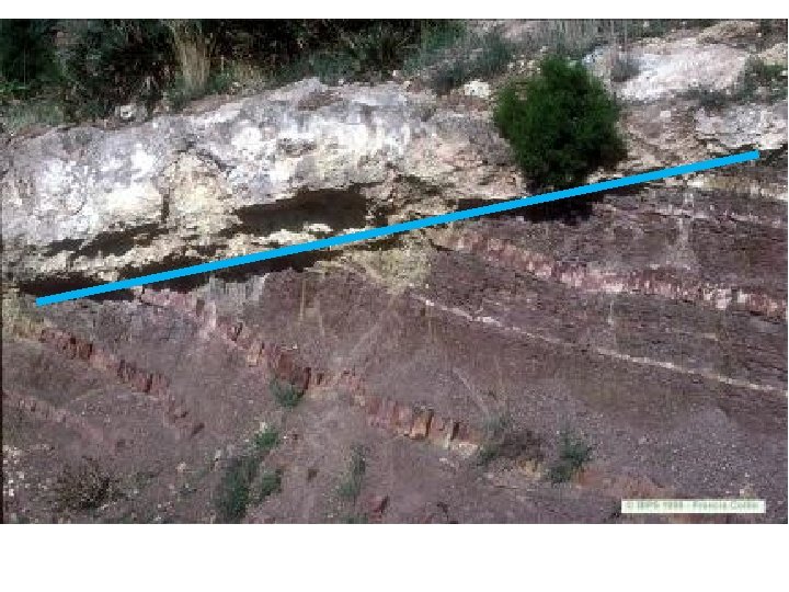 Principe de recoupement : Une structure géologique (une roche ou une déformation) est plus récente qu’une autre structure qu’elle recoupe. Ce principe s'applique à des situations très variées.