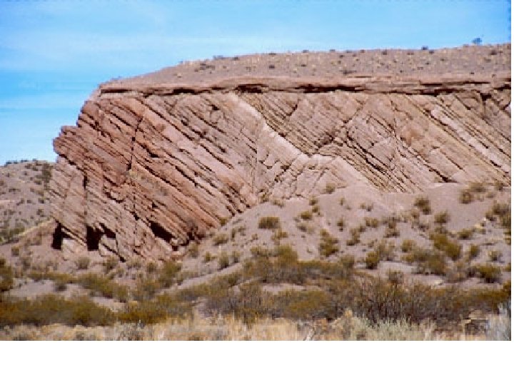 Trois déformations tectoniques (pli, faille normale, faille tectonique) et l’érosion recoupent des strates sédimentaires