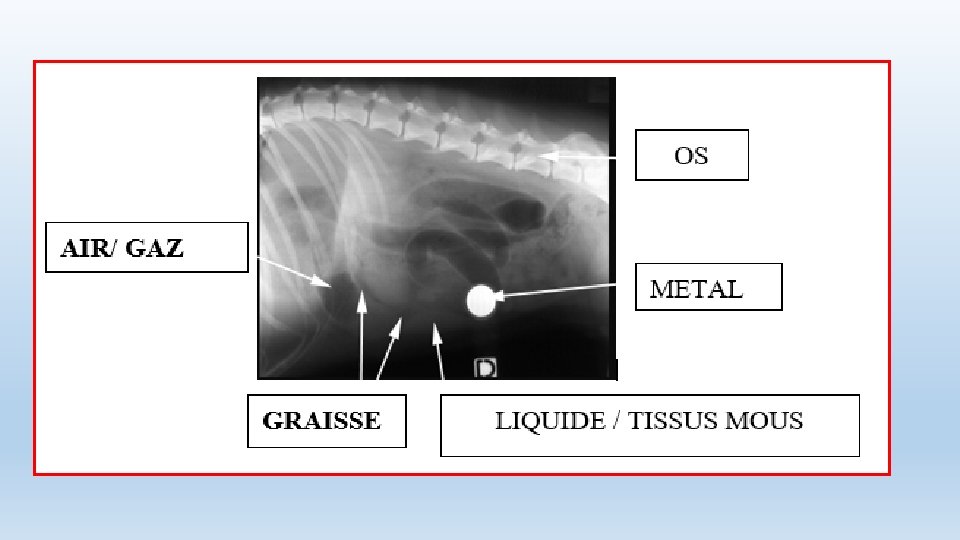 Cinq (5) catégories de structures sont discernées à la radiographie. Air, Graisse, Eau , Tissus mous et liquides, Os et métal Image traduite par une opacité dont l’aspect sémiologique diffère selon la nature AINSI Aux RX, ces substances se caractérisent par une image de tonalite différente.