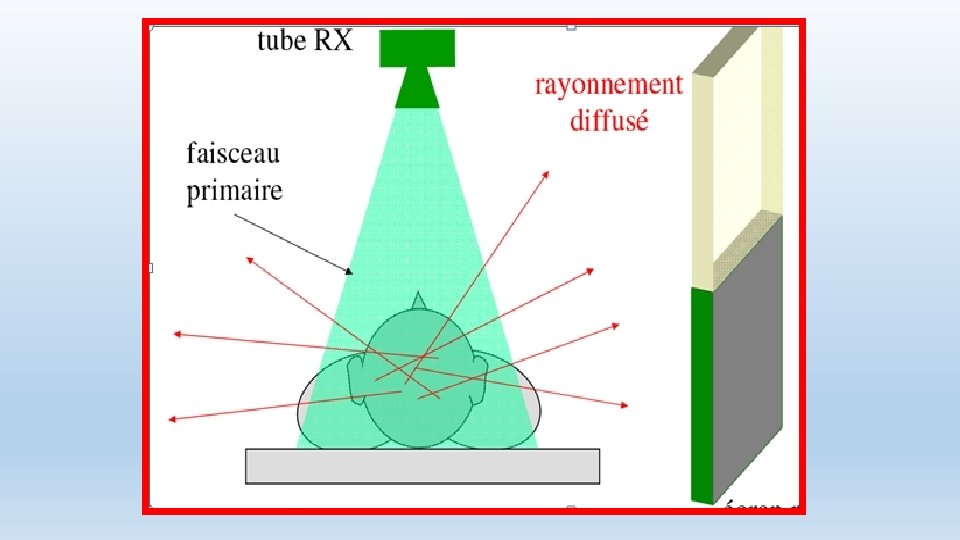 Lors du passage du faisceau de RX dans la matière, un rayonnement secondaire diffusant dans toutes les directions se forme, dont les effets secondaire néfastes influencent la qualité de l'image radiographique et conditionnent la plupart des mesures de protection associées à l'utilisation des RX.