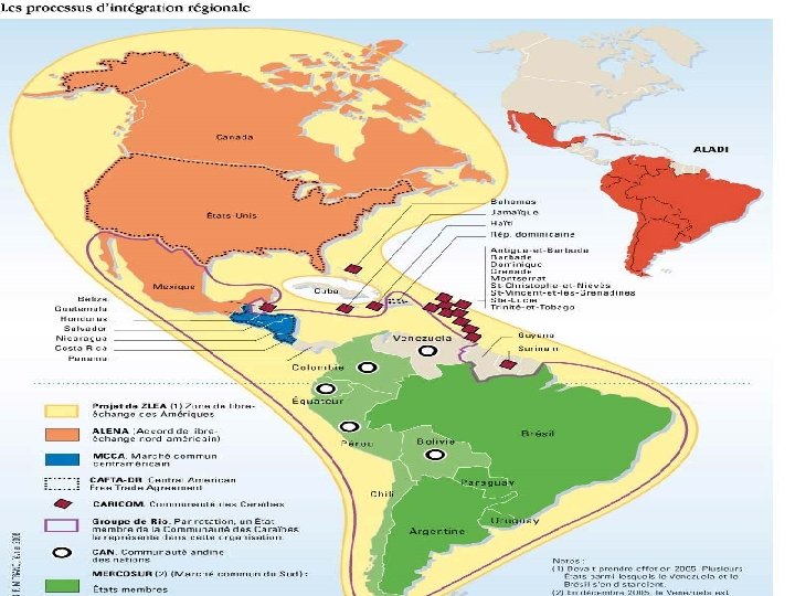 Les autres ensembles régionaux d’Amérique latine • La Communauté Andine des Nations est née en 1969 autour de l’Accord de Carthagène, entre la Bolivie, la Colombie, l’Equateur et le Pérou. • Le Marché commun centre-américain a été créé en 1960, autour du Traité de Managua, entre le Costa-Rica, le Salvador, le Guatemala, le Honduras et le Nicaragua. • La Communauté des Caraibes est née en 1973, autour du traité de Chaguaramas, entre la Barbade, le Guyana, la Jamaique, Trinité et Tobago. Aujourd’hui la communauté compte 14 pays membres.