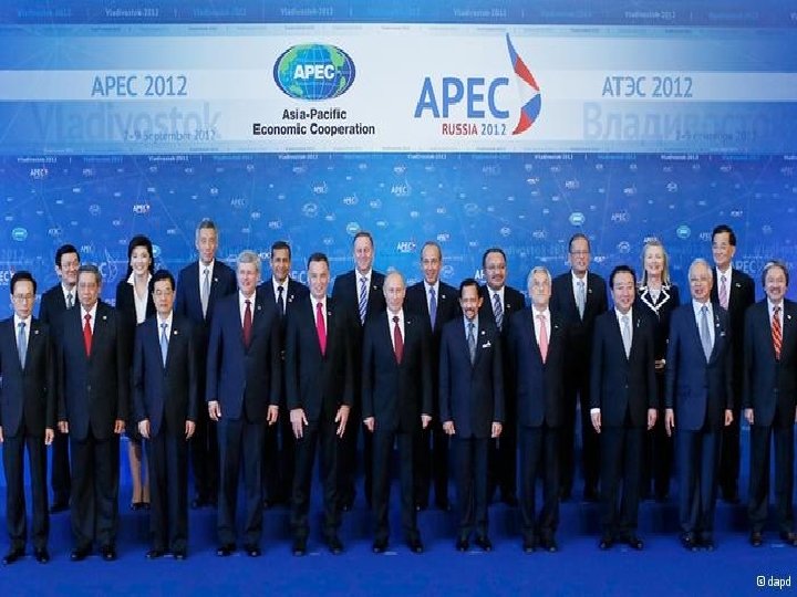 L’Asia Pacific Economic Cooperation, APEC • Le forum de Coopération Economique Asie. Pacifique (APEC) comprend 21 membres, qui diffèrent par leurs systèmes politiques, leurs institutions sociales et culturelles, et leurs niveaux de développement économique. • Les pays qui participent à l’APEC sont : l'Australie, Brunéï, le Canada, le Chili, la Chine, les États-Unis, Hong Kong, l'Indonésie, le Japon, la Malaisie, le Mexique, la Nouvelle-Zélande, la Papouasie. Nouvelle-Guinée, le Pérou, les Philippines, la République de Corée, la Russie, Singapour, le Taipei chinois, la Thaïlande et le Vietnam.