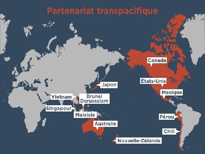 L’Accord de Partenariat Transpacifique PTP, ou Transpacific Partnership TPP En février 2016, après cinq ans d’intenses négociations, l’Accord de Partenariat Transpacifique (PTP) a été signé, à Auckland en Nouvelle-Zelande, entre 12 pays du pourtours du pacifique, à savoir l’Australie, Brunei, Canada, Chili, Japon, Malaisie, Mexique, Nouvelle-Zélande, Pérou, Singapour, Etats-Unis et Vietnam. L’accord donne naissance à une zone de libre-échange de 800 millions d’habitants, représentant 40% du PIB mondial, en l’occurrence la plus grande zone de libre-échange au monde. L’accord prévoit la suppressions à terme de 80% des droits de douane entre les pays signataires. La Chine n’est pas membre du PTP.