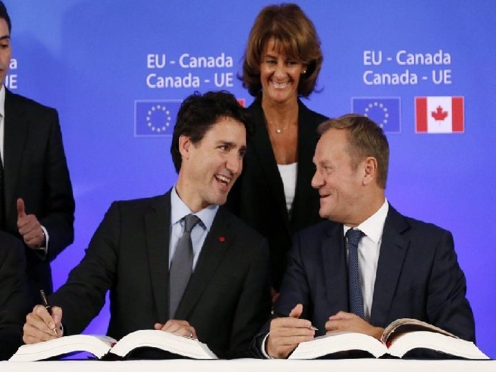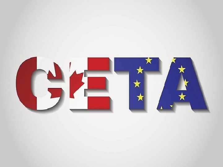 L'accord économique et commercial global, ou Comprehensive Economic and Trade Agreement (CETA), est le traité établi entre le Canada d'une part, et l'Union européenne — et ses 28 États membres— d'autre part 3, qui a été signé le 30 octobre 2016 par le Premier ministre canadien, Justin Trudeau, et le président du Conseil européen Donald Tusk 5. Avant sa mise en œuvre, « le texte de l'entente doit être ratifié par les parlements canadiens et ceux des vingt-huit États de l'Union européenne» . L'application provisoire de l'accord, qui concerne plus de 90 % de ses dispositions, est intervenue le 21 septembre 2017. Le CETA implique la suppression des droits de douane pour presque tous les produits, soit près de 98 % des droits de douanes entre les deux régions, dès la mise en œuvre de l'accord. Pour certains produits l'élimination des droits de douanes est progressive sur 3, 5 ou 7 ans, notamment pour le secteur automobile, certains produits de la mer et quelques produits agricoles.