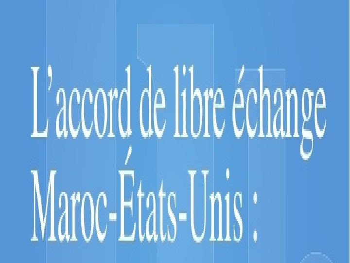 L'accord de libre-échange entre les Etats- Unis et le Maroc est entré en vigueur le 1 er janvier 2006. Les droits de douane sur plus de 95 % des produits ont été immédiatement éliminés. Les droits sur la plupart des autres produits ont été éliminés sur une période de 9 ans à compter de la date d’entrée en vigueur de l’Accord. En outre, l’accord offre l’accès aux services, une protection de la propriété intellectuelle, des instruments juridiques de garantie et de sécurité pour les investisseurs américains, des mesures de transparence ainsi que dans la passation des marchés publics.