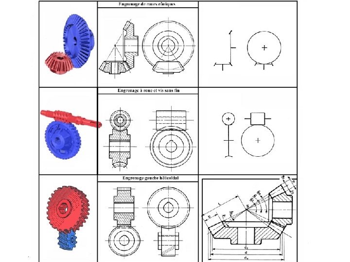 Dimensions caractéristiques Le ½ angle au sommet des cônes. Type de dentures Droites Hélicoïdales Spirale Le nombre de filets de la vis