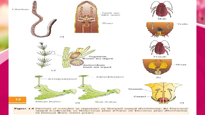 Sexuality in organisms • • • In some organisms both the sexes are present in the same individual (monoecious or homothallic or bisexual or hermaphrodites) example: cucurbits, coconut , Leech, earthworm , sponge , tapeworm. in others, they are present in two individuals (dioecious or heterothallic or unisexual). Example: Papaya, and date palm, cockroach. In a unisexual flower, the male flower is called staminate and the female flower is called pistillate. Gamete formation takes place by cell division. In haploid parents like in monera , fungi , algae, bryophytes , it is by mitosis; in diploid parents like gymnosperms, angiosperms and in animals it is by meiosis, with specialised cells called meiocytes( gamete mother cell) undergoing meiosis so that each gamete gets only one set of chromosomes.