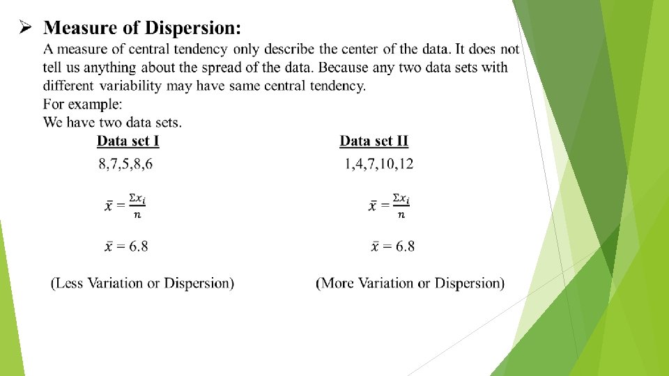 Ø Introduction: ü The word dispersion has a technical meaning in statistics. The average measures the center of the data, dispersion means the spread or scatterness of observations in a data set. ü Another feature of the observation is how the observations are spread about the center. The observations may be close to the center or they may be spread away from the center. ü If the observations are close to the center (usually the arithmetic mean or median), we say that dispersion, scatter or variation is small. ü If the observations are spread away from the center, we say dispersion is large.