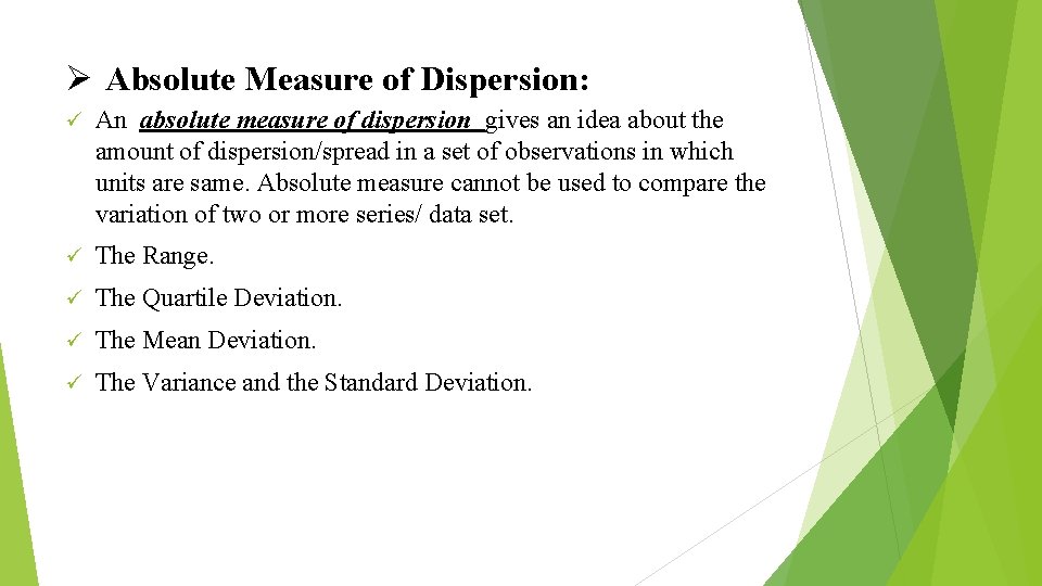 Ø Absolute Measure of Dispersion: ü An absolute measure of dispersion gives an idea about the amount of dispersion/spread in a set of observations in which units are same. Absolute measure cannot be used to compare the variation of two or more series/ data set. ü The Range. ü The Quartile Deviation. ü The Mean Deviation. ü The Variance and the Standard Deviation.