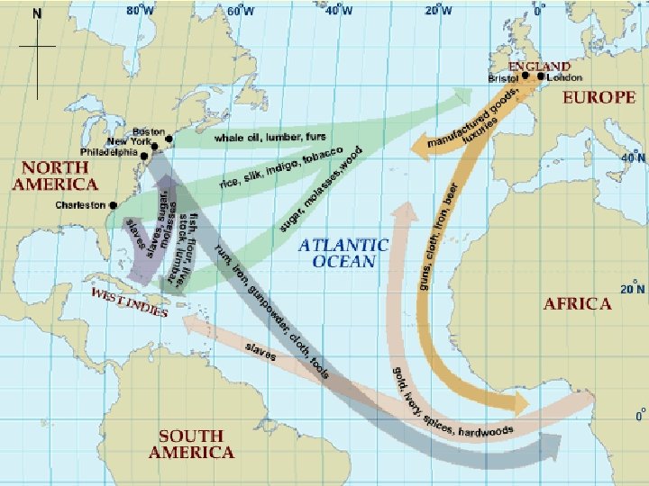 • Trading was also a popular and prevalent industry, as commerce occurred all around the colonies. – The “triangular trade” was common: a ship, for example, would leave • (1) New England with rum and go to the • (2) Gold Coast of Africa and trade it for African slaves. • Then, it would go to the (3) West Indies and exchange the slaves for molasses (for rum), which it’d sell to New England once it returned there.