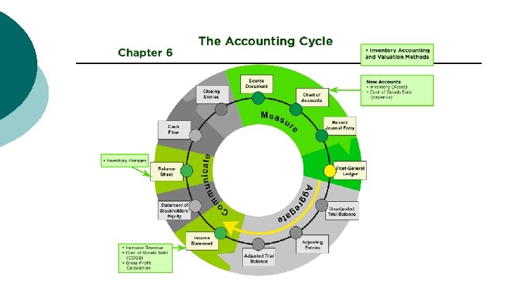 Questions to be Answered Overall - How has society shaped today’s financial reporting? Chapters 4 – 10 – dive deeper into each area of accounts to understand the associated accounting rules and the impact to the income statement and balance sheet. Chapter 6 – Overall focus on this chapter is 1. ) How we record inventory purchase costs on the balance sheet, 2. ) How do we record sales of inventory, 3. ) How do we calculate the costs of the inventory sold, and 4. ) What is the balance ($ value) in ending inventory after we make a sale.