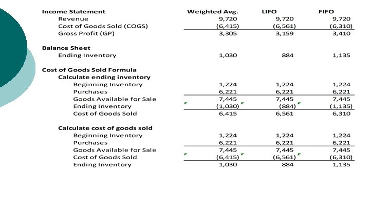 FIFO Cost of goods sold Ending inventory 72 tents $17 $1, 224 43 tents $22 $946 103 tents $19 $1, 957 9 tents $21 $189 149 tents $21 $3, 129 52 tents 324 tents $6, 310 Oldest costs flow through income 45 Newest costs in inventory $1, 135