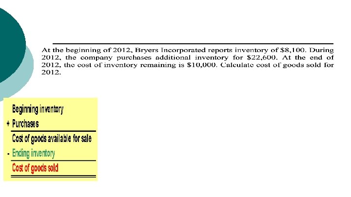 Exercise – On October 26 th, Sell 324 Units for $30 each Beginning Inventory and Purchases Date Beg. inventory Cost per unit Total cost 72 tents $17 $1, 224 103 tents $19 $1, 957 Oct. 19 158 tents $21 $3, 318 Oct. 25 43 tents $22 $946 Oct. 4 40 Units Calculate the cost of goods sold and ending inventory.
