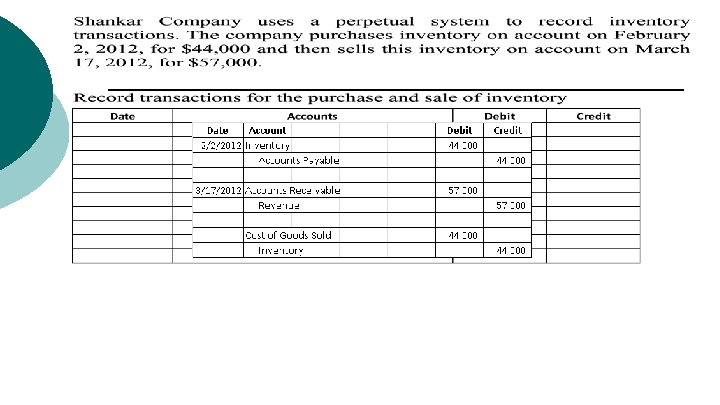 Inventory Purchases- Discounts, Allowances, Returns ¡ Cost of Inventory (COGS) l When we purchase inventory, we are offered discounts, allowances, and returns from the vendor. These are recorded into the INVENTORY account (NO CONTRA ACCOUNTS). l Example - $10, 000 inventory purchase on account and $500 returned two weeks later.
