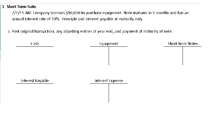 Short-term Notes Payable – 12/1/15 - ABC Company borrows $30, 000 to purchase equipment. Note due 3/1/16, annual interest rate = 9%. Interest and principal paid at maturity. Journal Entry initial transaction, year-end adjusting entry, & maturity Formula to calculate Interest Expense Interest = Face value x Annual interest rate x Fraction of the Yea r