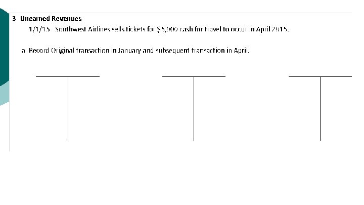 Deferred Revenues Definition - Business receives cash before services or products are provided to customers. Therefore, company cannot recognize any revenue when cash is received. Results in a liability (repay if don’t deliver) Steps: 1. Record cash receipt and set up deferred revenue account (liability) 2. As services or products are provided and revenue is earned, an adjusting journal entry is completed to recognize revenue earned. 1. Debit deferred revenue and credit revenue account. Complete Journal Entries: 2/1 – “I am the Best DJ, Inc. ” receives $300 deposit in advance for DJ for a Fraternity Party. 2/28 – Performs the best DJ services 21