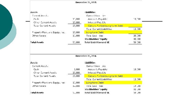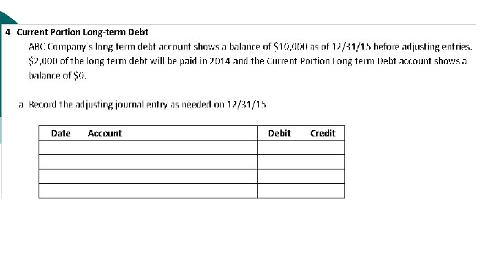 Current Portion of Long-Term Debt – ¡ Southwest Airlines Example if they just took out 3. 154 million of LTD JOURNAL Date Accounts and explanation Debit 12/31 Cash 3, 154 Mil. Long-Term Debt Current Portion Long-Term Debt 27 Credit 2, 883 Mil. 271 Mil.